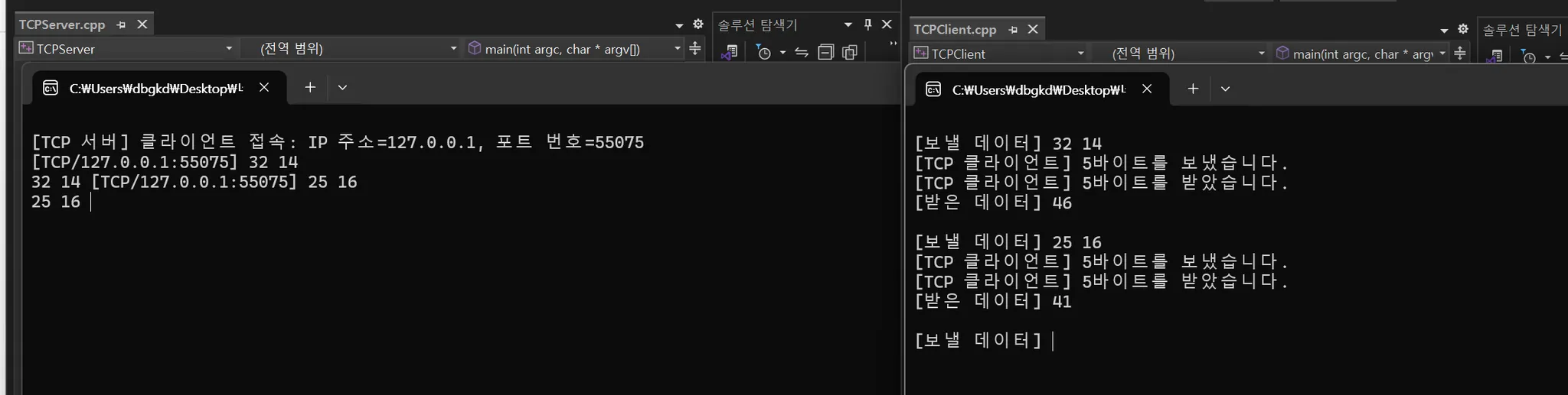 Q 4_4. TCPServer/TCPClient 예제를 수정하여, 클라이언트에서 32비트 정수 두 개를 입력받아 보내면 서버에서 두 수의 합을 계산하여 숫자 형태로 리턴하도록 하시오.